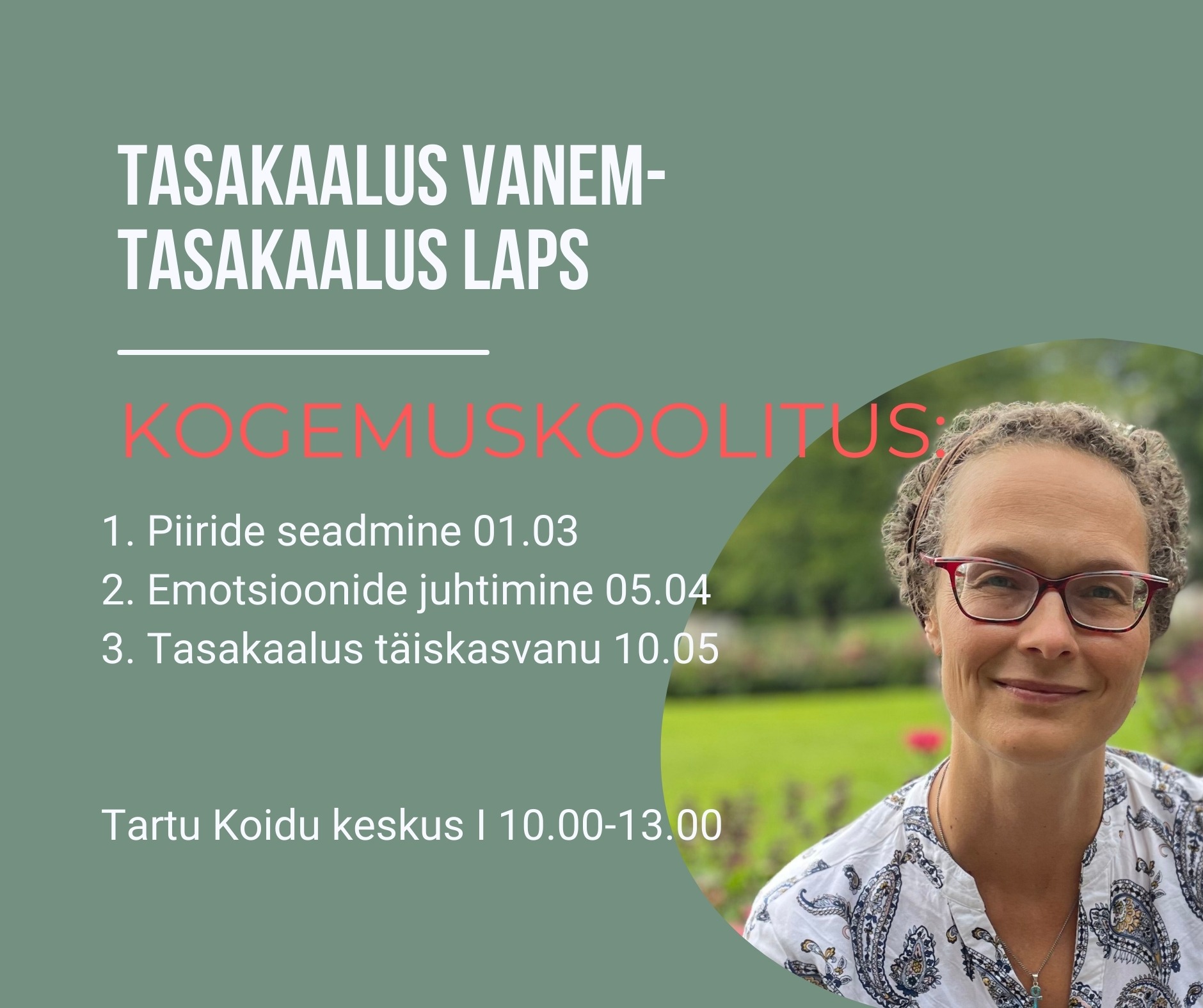 Koolitused toimuvad Tartu Koidu keskuse peamajas pühapäeviti 01.03, 05.04 ja 10.05 kell 10.00-13.00.